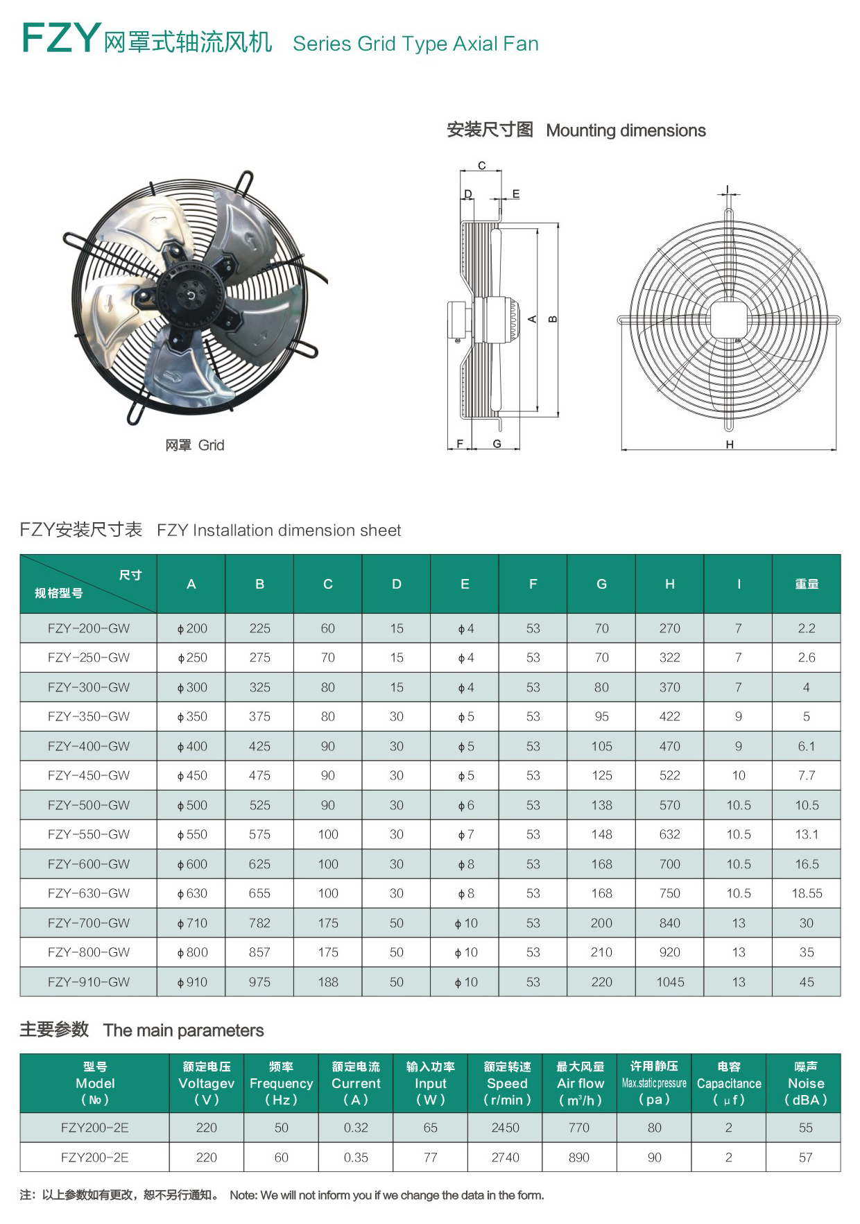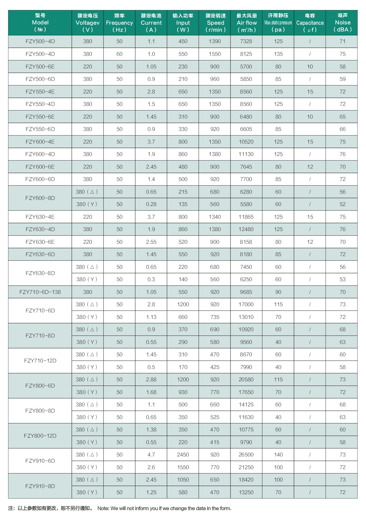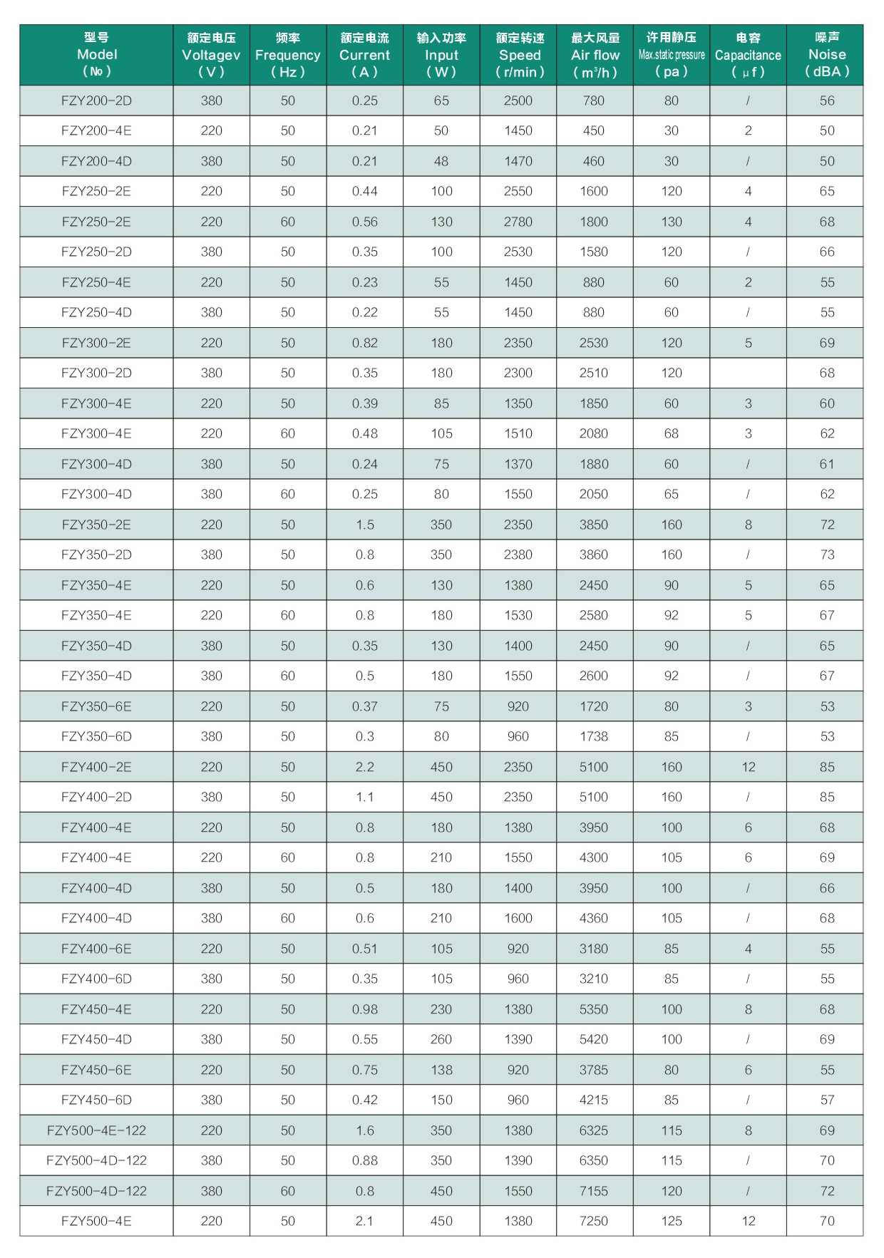 * FZY系列轴流风机为外转子电机,该系列外转子电机具有结构紧凑、安装方便、运行可靠、噪音低、节能高效等特点。