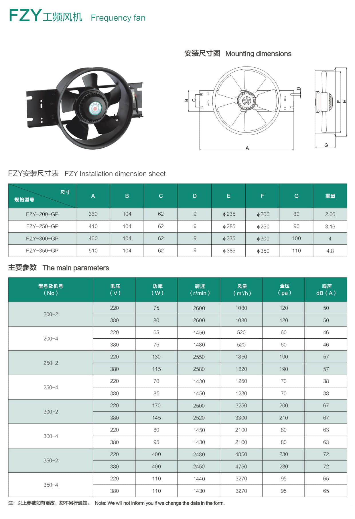 * FZY系列工频风机为外转子电机,该系列外转子电机具有结构紧凑、安装方便、运行可靠、噪音低、节能高效等特点。