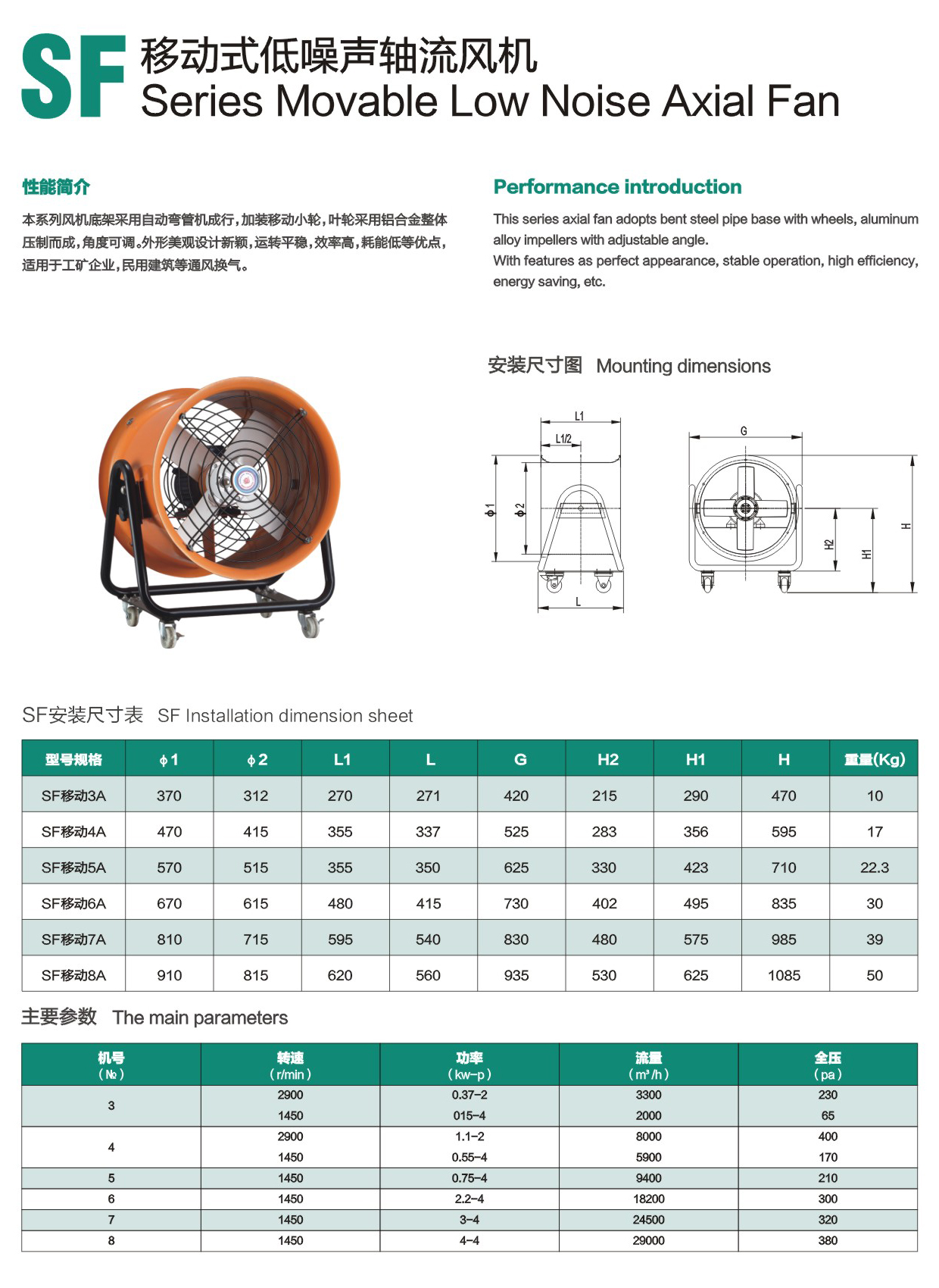 * 本系列风机底架采用自动弯管机成行,加装移动小轮,叶轮采用铝合金整体 压制而成,角度可调。外形美观设计新颖,运转平稳,效率高,耗能低等优点,适用于工矿企业,民用建筑等通风换气。