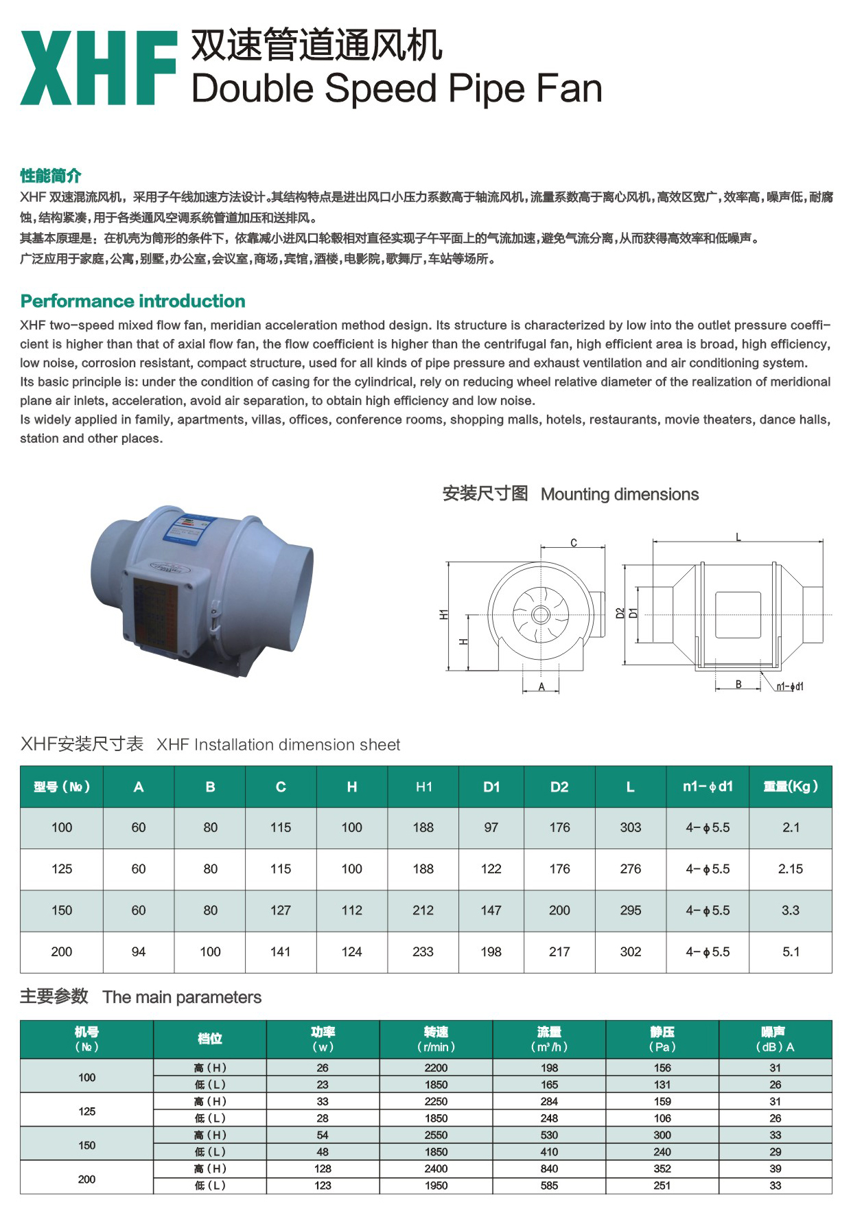 * XHF双速混流风机,采用子午线加速方法设计。其结构特点是进出风口小压力系数高于轴流风机,流量系数高于离心风机,高效区宽广,效率高,噪声低,耐腐蚀,结构紧凑,用于各类通风 空调系统管道加压和送排风。