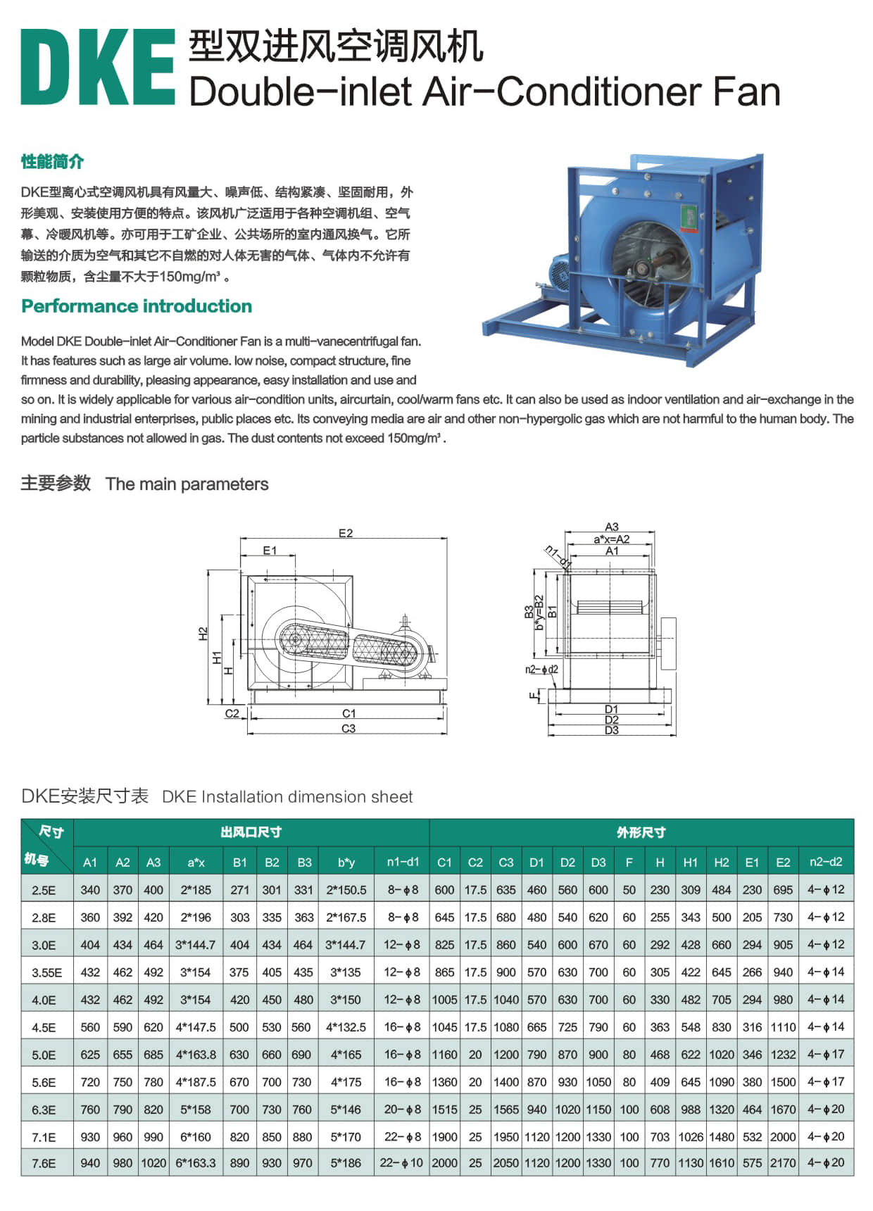 * DKE型离心式空调风机具有风量大、噪声低、结构紧湊、坚固耐用,外形美观、安装使用方便的特点。该风机广泛适用于各种空调机组、空气幕、冷暖风机等。亦可用于工矿企业、公共场所的室内通风换气。它所输送的介质为空气和其它不自燃的对人体无害的气体、气体内不允许有颗粒物质,含尘量不大于150mg/m³