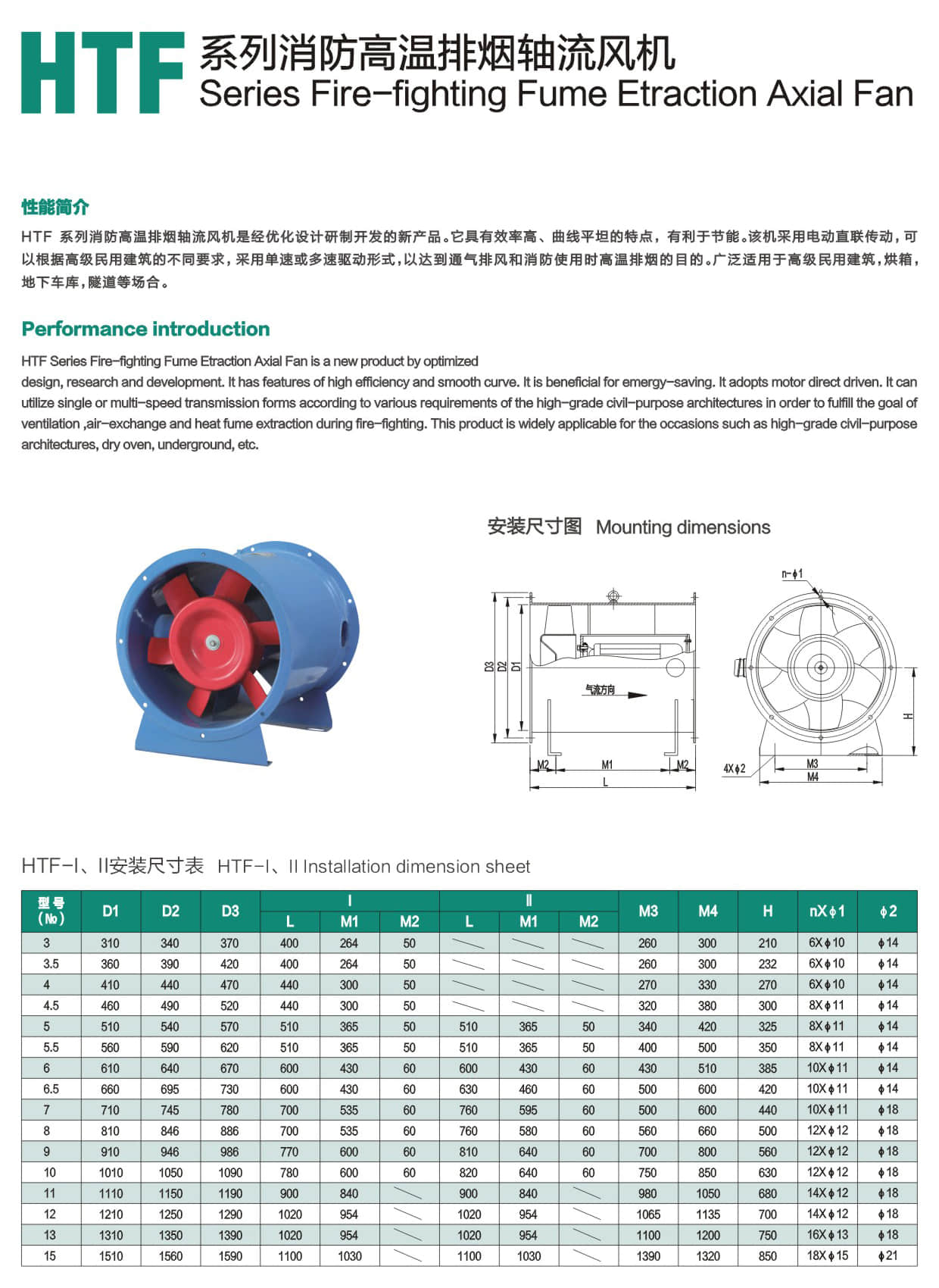 * HTF系列消防高温排烟轴流风机是经优化设计研制开发的新产品。 它具有效率高、曲线平坦的特点,有利于节能。该机采用电动直联传动,可以根据高级民用建筑的不同要求,采用单速或多速驱动形式,以达到通气排风和消防使用时高温排烟的目的。广泛适用于高级民用建筑,烘箱,地下车库,隧道等场合。