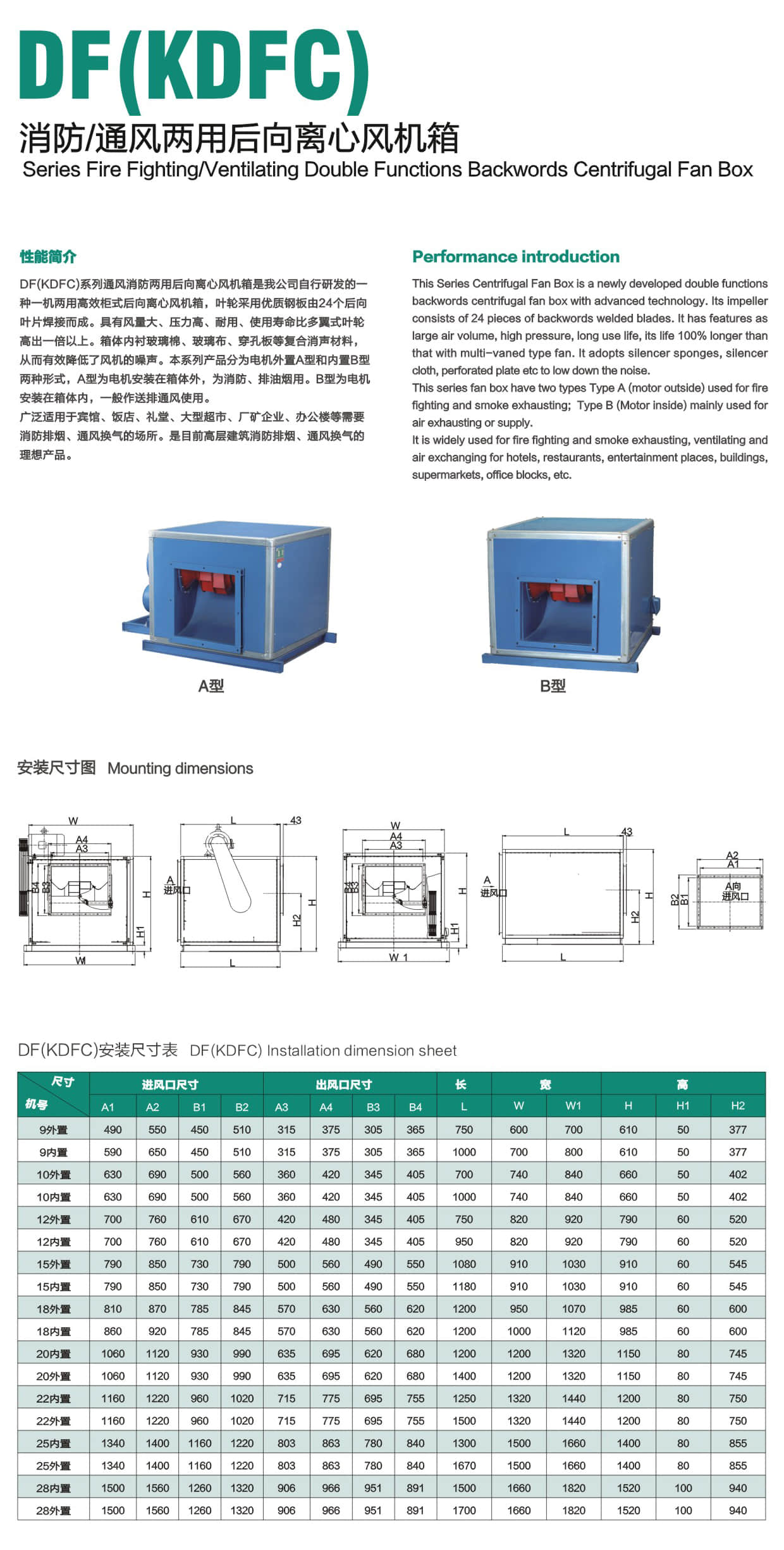 * DF(KDFC)系列通风消防两用后向离心风机箱是我公司自行研发的一 种一机两用高效柜式后向离心风机箱,叶轮采用优质钢板由24个后向叶片焊接而成。具有风量大、压力高、耐用、使用寿命比多翼式叶轮高出一倍以上。箱体内衬玻璃棉、玻璃布、穿孔板等复合消声材料,从而有效降低了风机的噪声。本系列产品分为电机外置A型和内置B型两种形式,A型为电机安装在箱体外,为消防、排油烟用。B型为电机安装在箱体内,一般作送排通风使用。