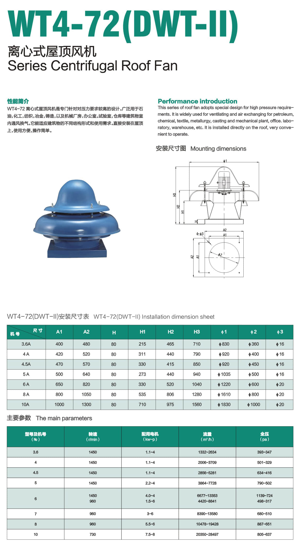 * WT4-72离心式屋顶风机是专门针对对压力要求较高的设计。广泛用于石油,化工,纺织,冶金,铸造,以及机械厂房,办公室,试验室,仓库等建筑物室内通风换气。它能适应建筑物的不同结构形式和使用需求。直接安装在屋顶上,使用方便,操作简单。