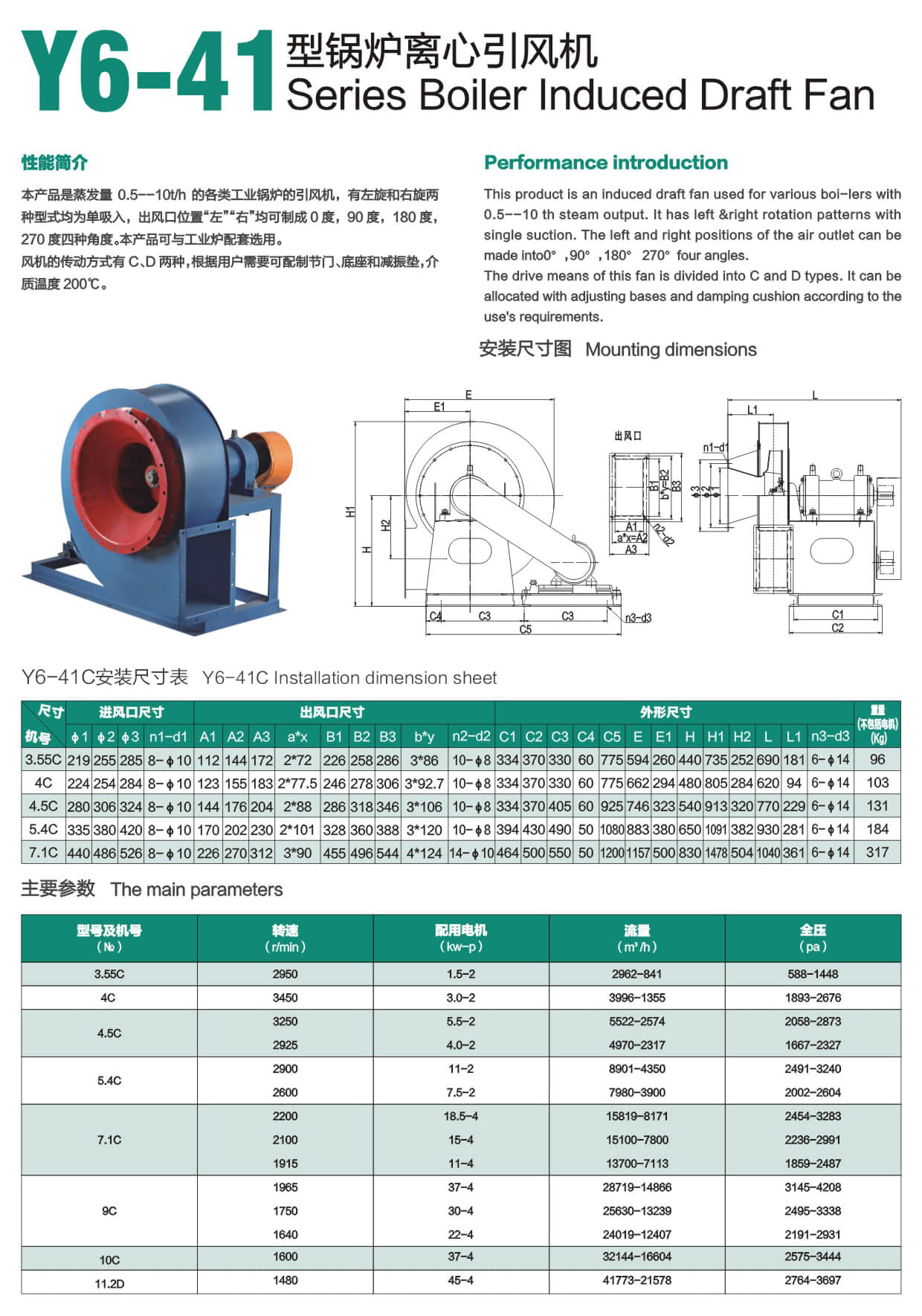 * Y6-41型锅炉离心引风机是蒸发量0.5--10t/h的各类工业锅炉的引风机,有左旋和右旋两种型式均为单吸入,出风口位置“左”“右”均可制成0度,90 度,180度,270 度四种角度。本产品可与工业炉配套选用。
