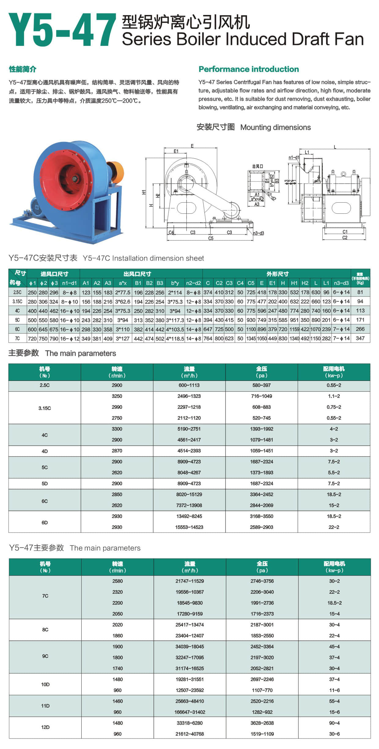 * Y5-47型离心引风机具有噪声低,结构简单、灵活调节风量、风向的特点,适用于除尘、排尘、锅炉鼓风,通风换气、物料输送等,性能具有流量较大,压力具中等特点,介质温度250℃—200℃。