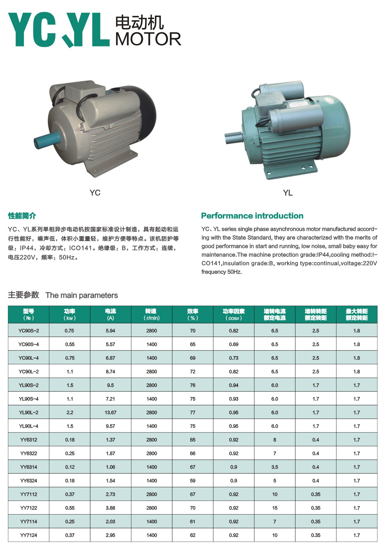 * YC、YL系列单相异步电动机按国家标准设计制造,具有起动和运 行性能好,噪声低,体积小重量轻,维护方便等特点。该机防护等级:1P44,冷却方式:1C0141。绝缘级:B,工作方式:连续,电压220V,频率:50Hz。