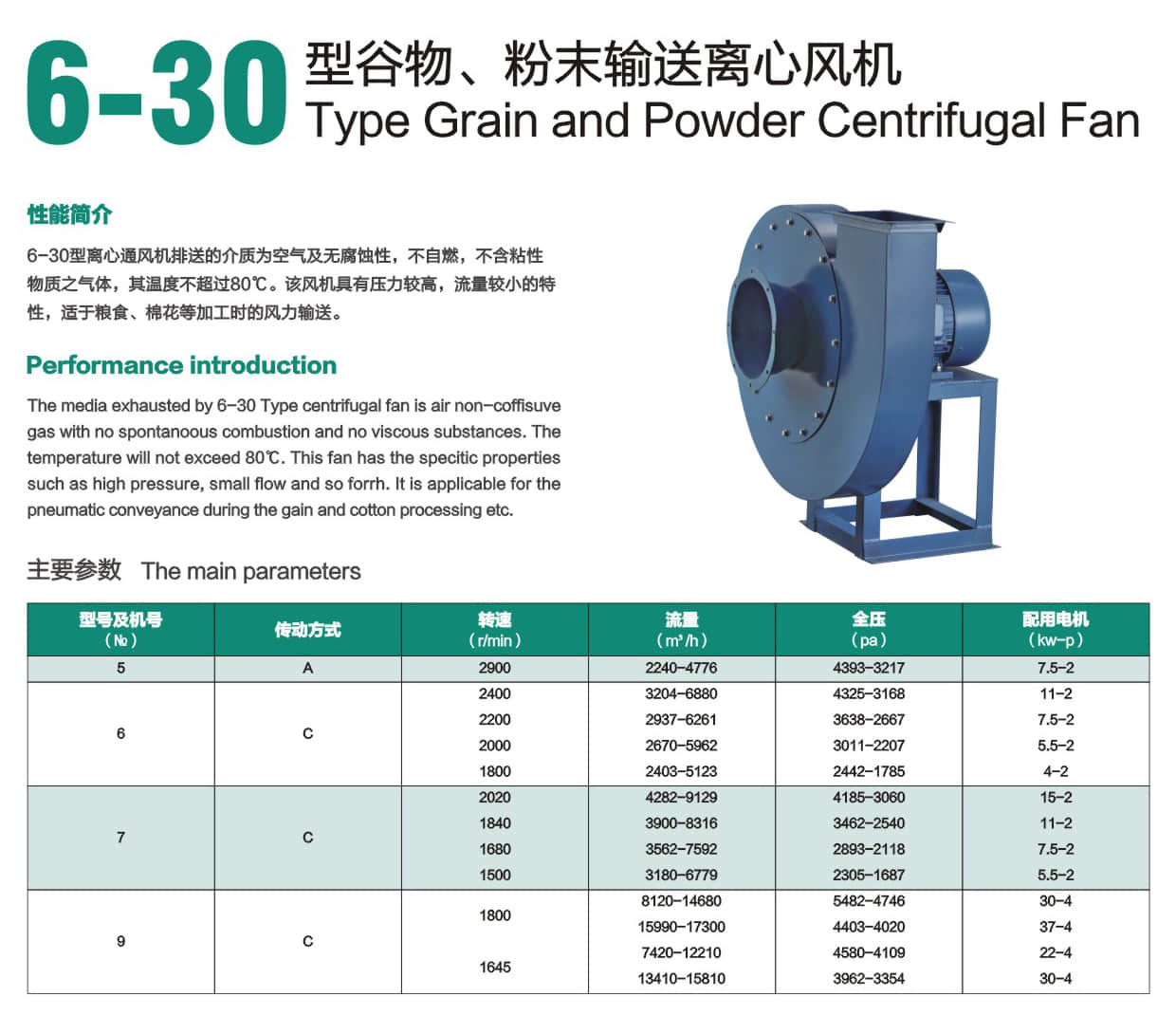 * The media exhausted by 6-30 Type centrifugal fan is air non-coffisuve gas with no spontanoous combustion and no viscous substances. The temperature will not exceed 80℃. This fan has the specitic properties such as high pressure, small flow and so forrh. It is applicable for the pneumatic conveyance during the gain and cotton processing etc.