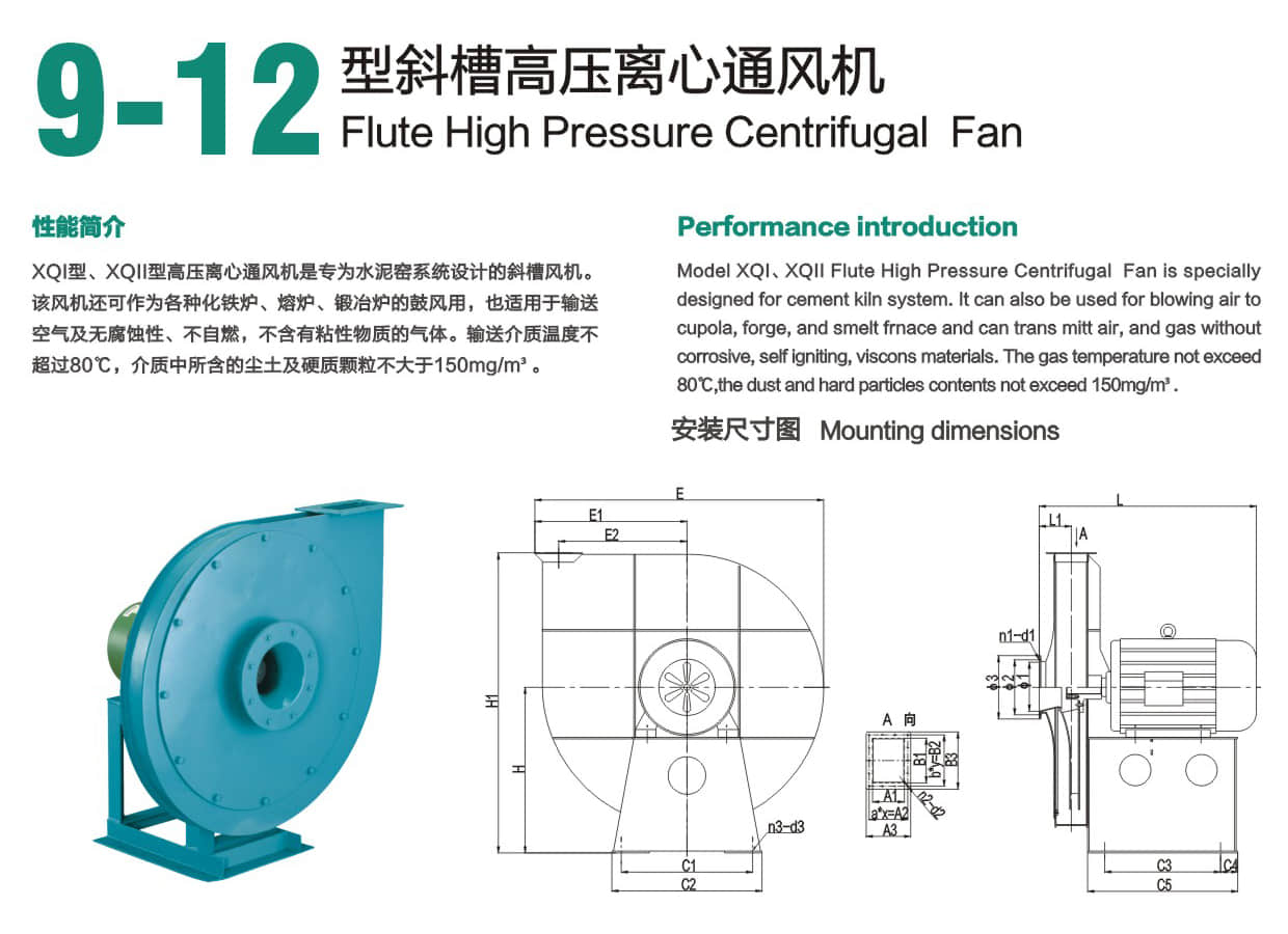 * Model XQI、XQII Flute High Pressure Centrifugal Fan is specially designed for cement kiln system. It can also be used for blowing air to cupola, forge, and smelt frnace and can trans mitt air, and gas without corrosive, self勺niting, viscons materials. The gas temperature not exceed 80℃,the dust and hard particles contents not exceed,50mg/m³.