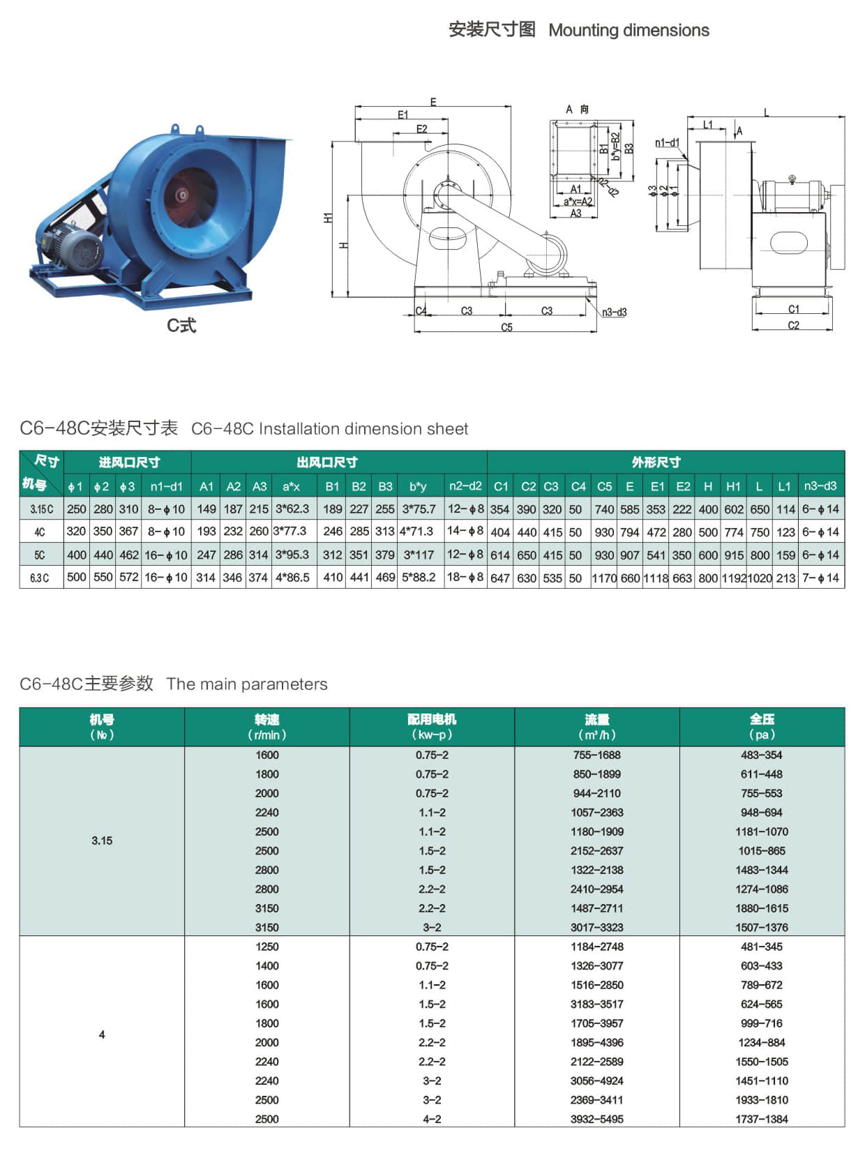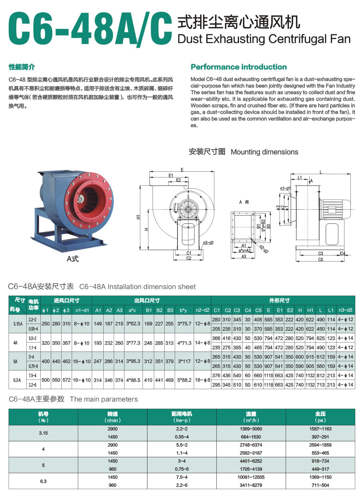 * Model C6-48 dust exhausting centrifugal fan is a dust-exhausting special-purpose fan which has been jointly designed with the Fan Industry The series fan has the features such as uneasy to collect dust and fine wear-ability etc. It is applicable for exhausting gas containing dust. Wooden scraps, fin and crushed fiber etc. (If there are hard particles In gas, a dust-collecting device should be installed in front of the fan). It can also be used as the common ventilation and air-exchange purposes.