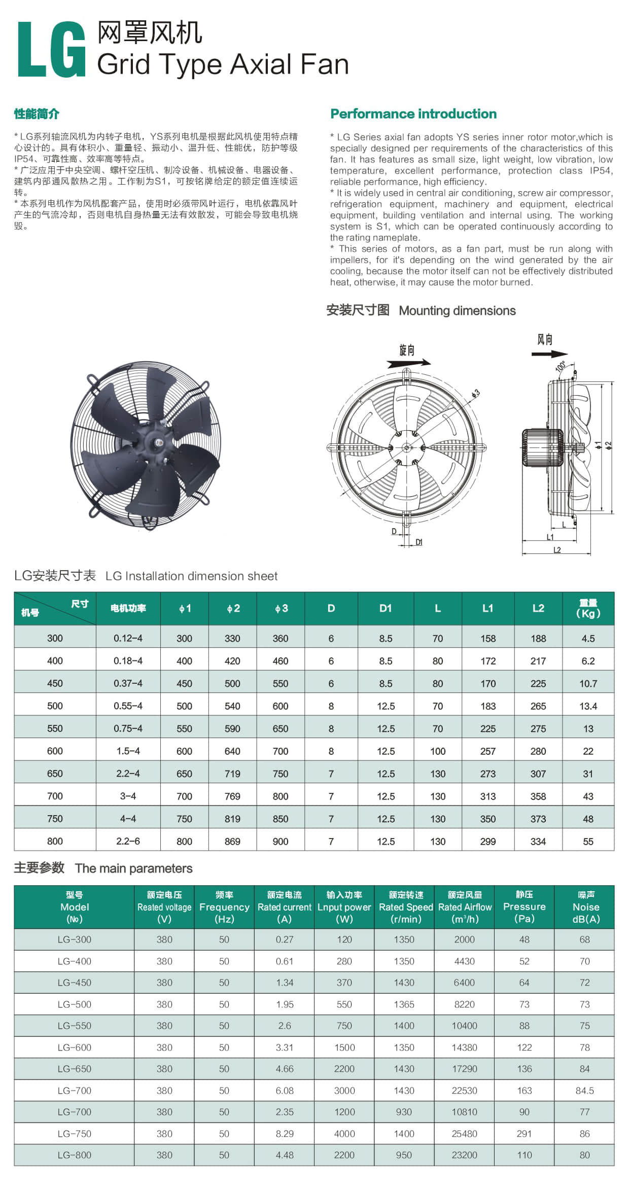 * LG Series axial fan adopts YS series inner rotor motor,which is specially designed per requirements of the characteristics of this fan.It has features as small size,light weight, low vibration,low temperature,excellent performance,protection class IP54,reliable performance,high e衍ciency.