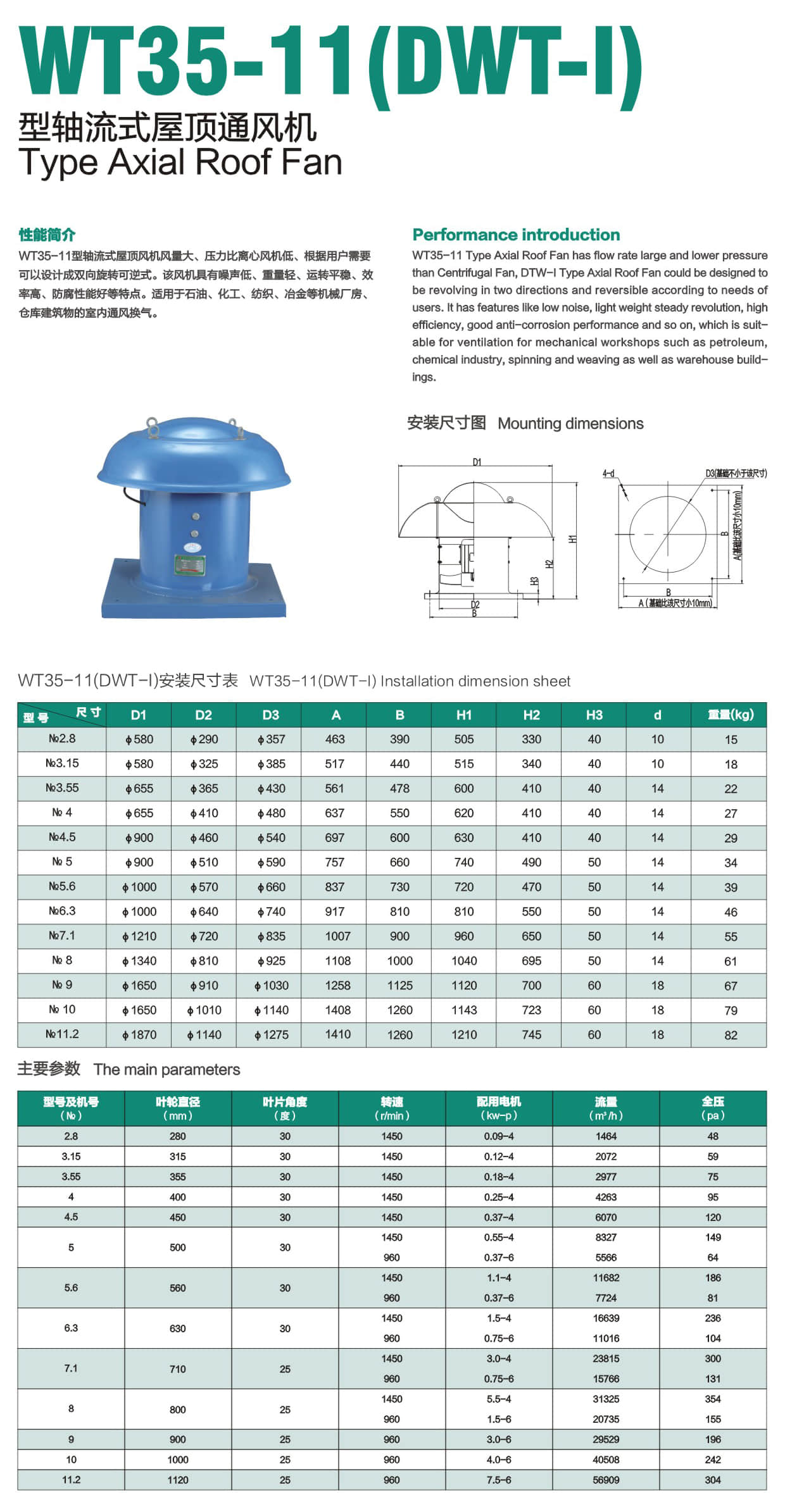 * WT35-11 Type Axial Roof Fan has flow rate large and lower pressure than Centrifugal Fan, DTW-I Type Axial Roof Fan could be designed to be revolving in two directions and reversible according to needs of users. It has features like low noise, light weight steady revolution, high efficiency, good anti-corrosion performance and so on, which is suitable for ventilation for mechanical workshops such as petroleum,chemical industry, spinning and weaving as well as warehouse buildings.